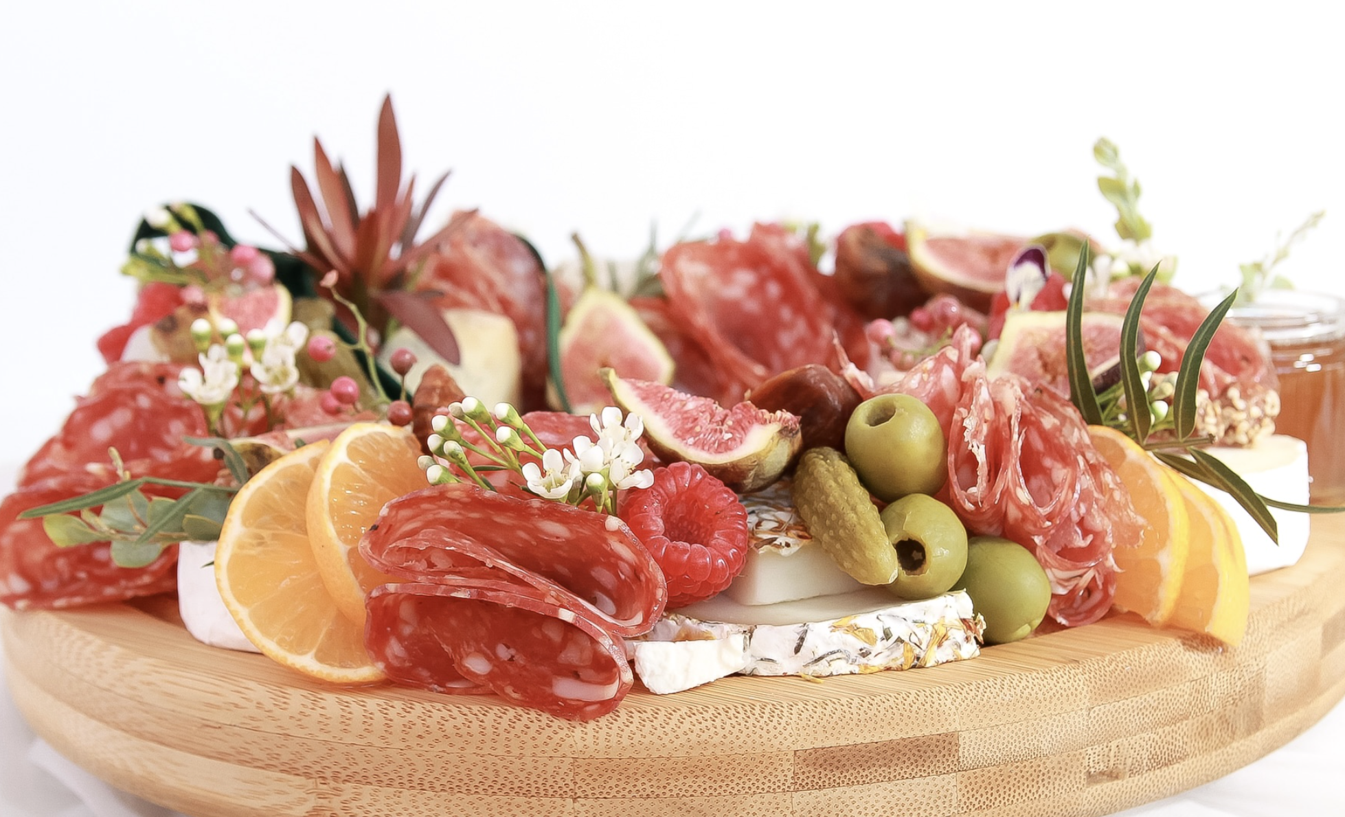 Artisan cheeses, charcuterie meats, fresh local organic fruit, dried fruit, California-grown nuts, olives, cornichons, local raw honey, fruit preserves, edible flowers & garnish. On disposable wood board and eco-friendly wood serving utensils.