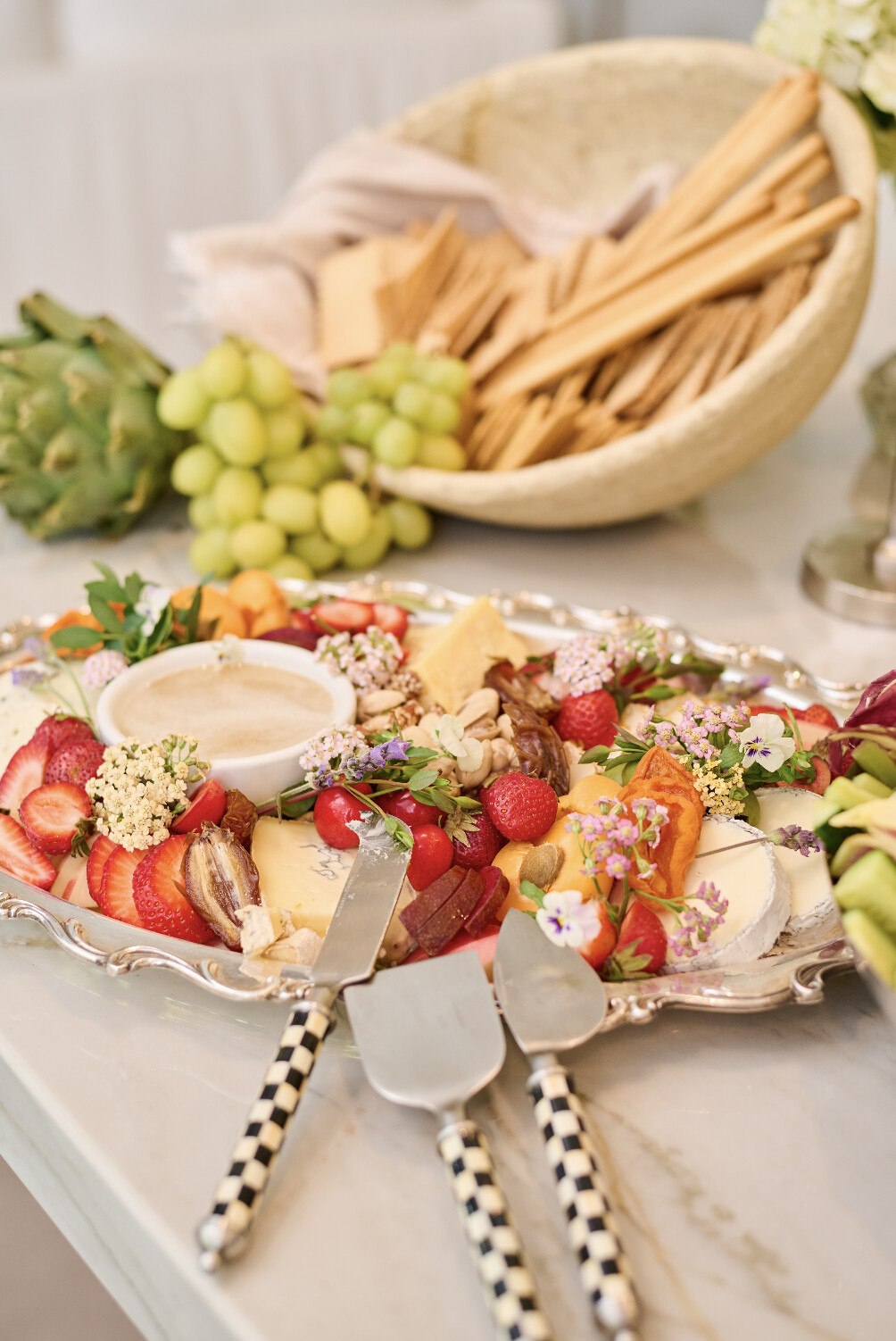 Includes artisan cheeses, fresh local organic fruit, dried fruit, California-grown nuts, olives, local raw honey, fruit jams or preserves , edible flowers & garnish. On disposable wood board and eco-friendly wood serving utensils.