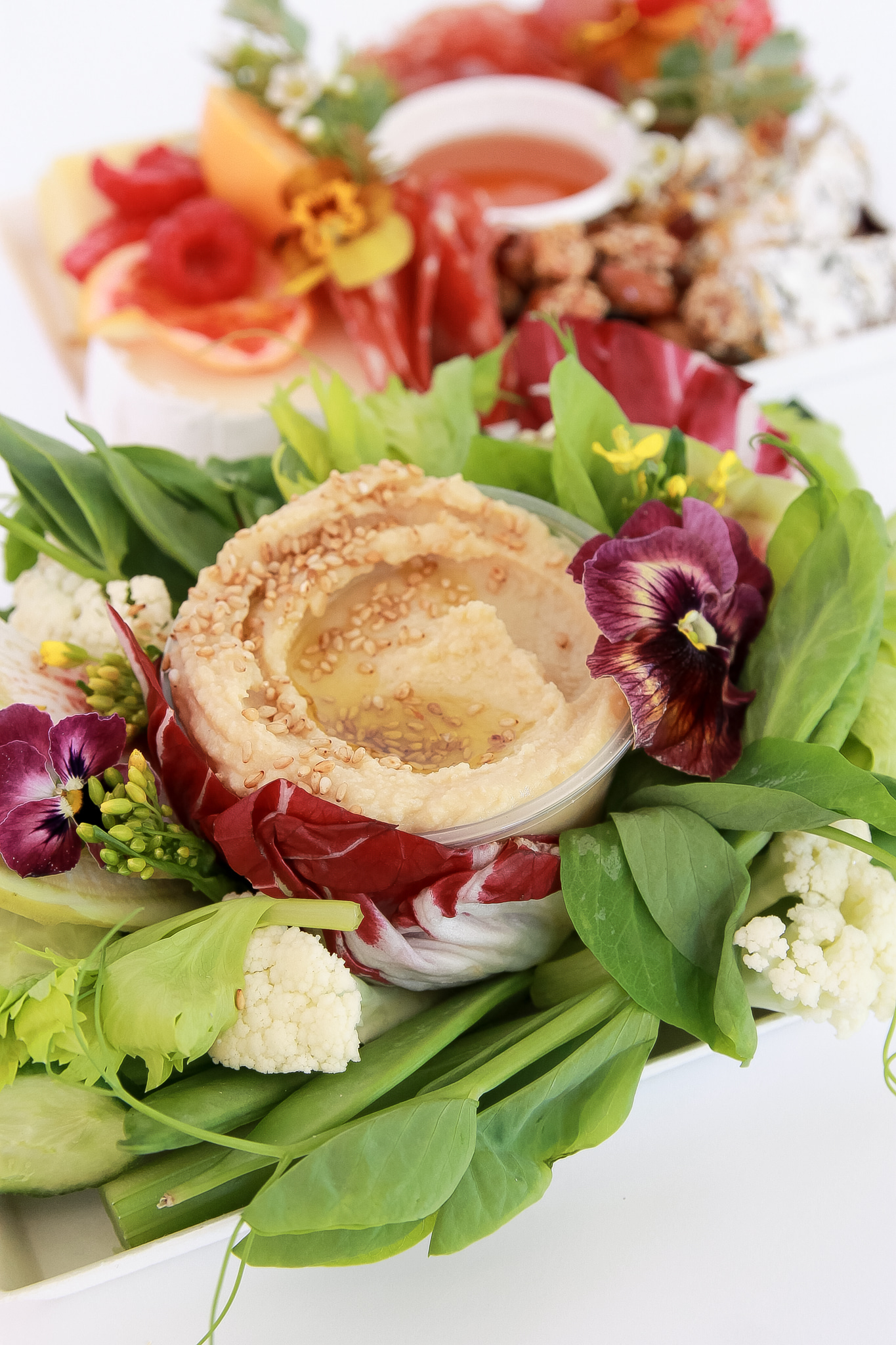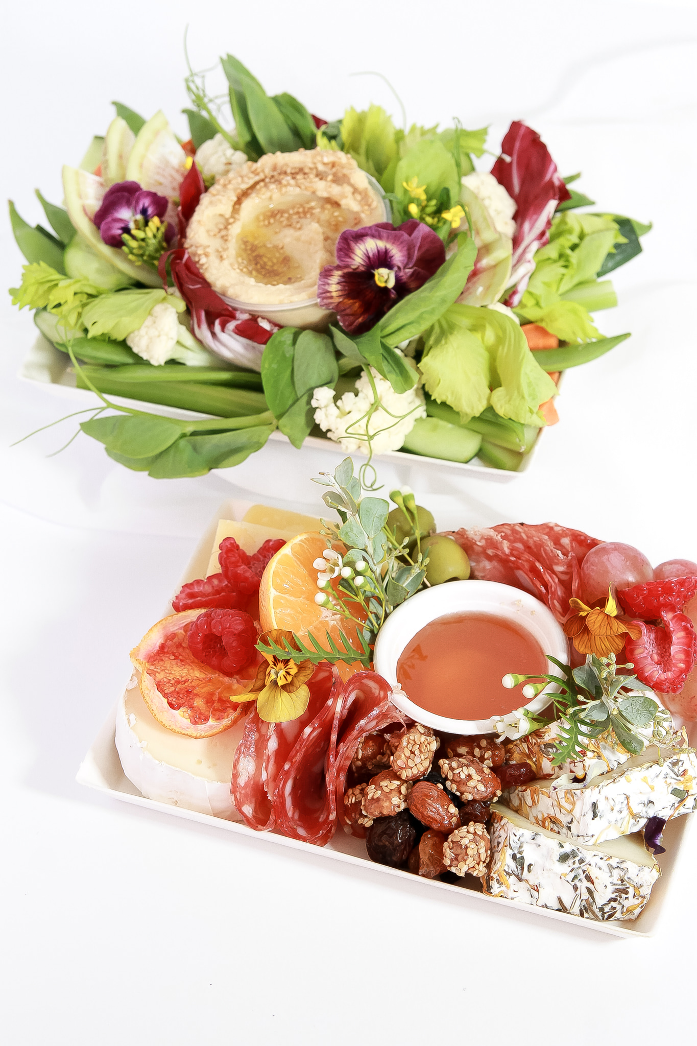 Includes artisan cheeses, charcuterie meats, fresh local organic fruit, dried fruit, California-grown nuts, olives, cornichons, local, edible flowers & garnish.
